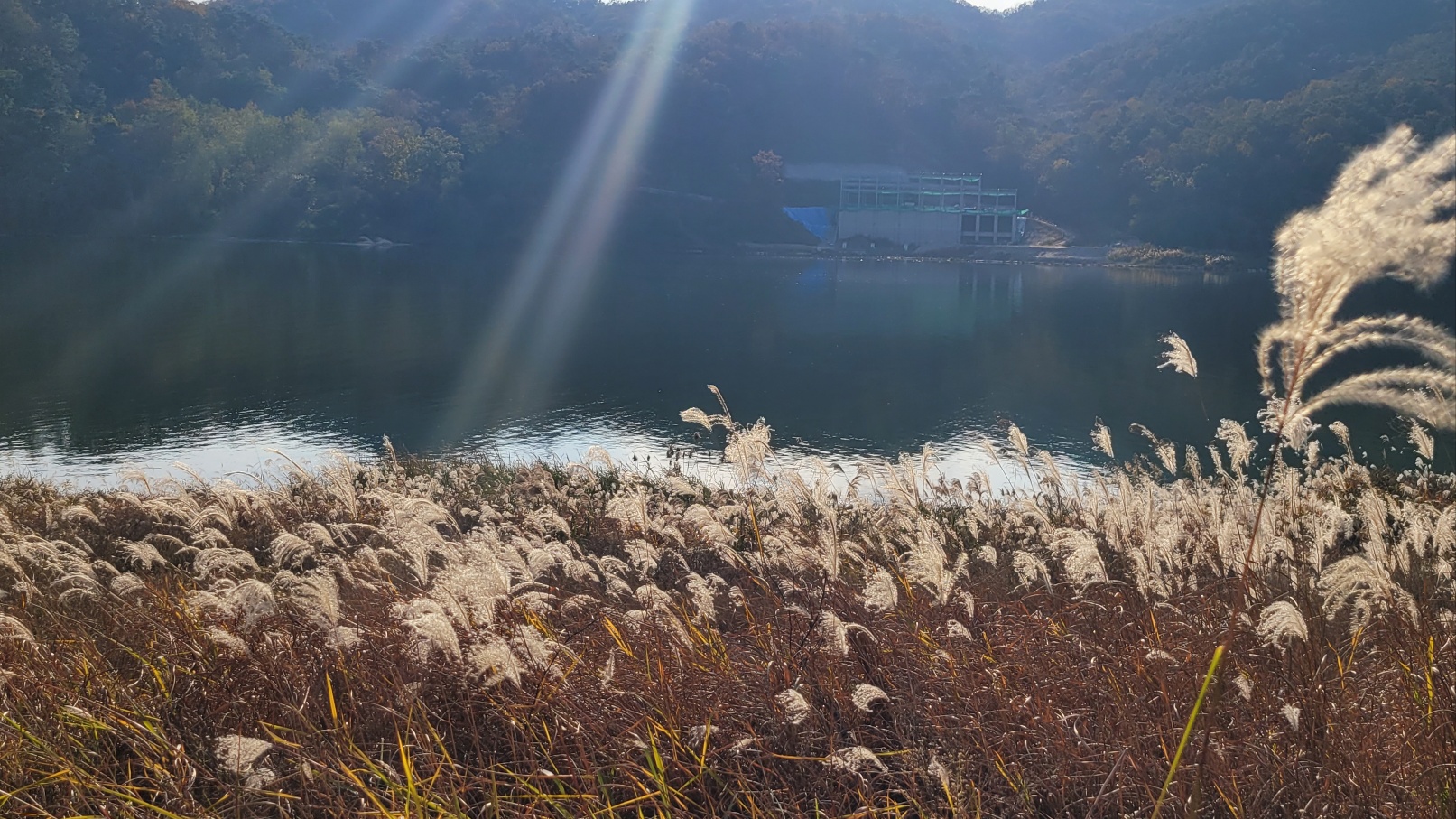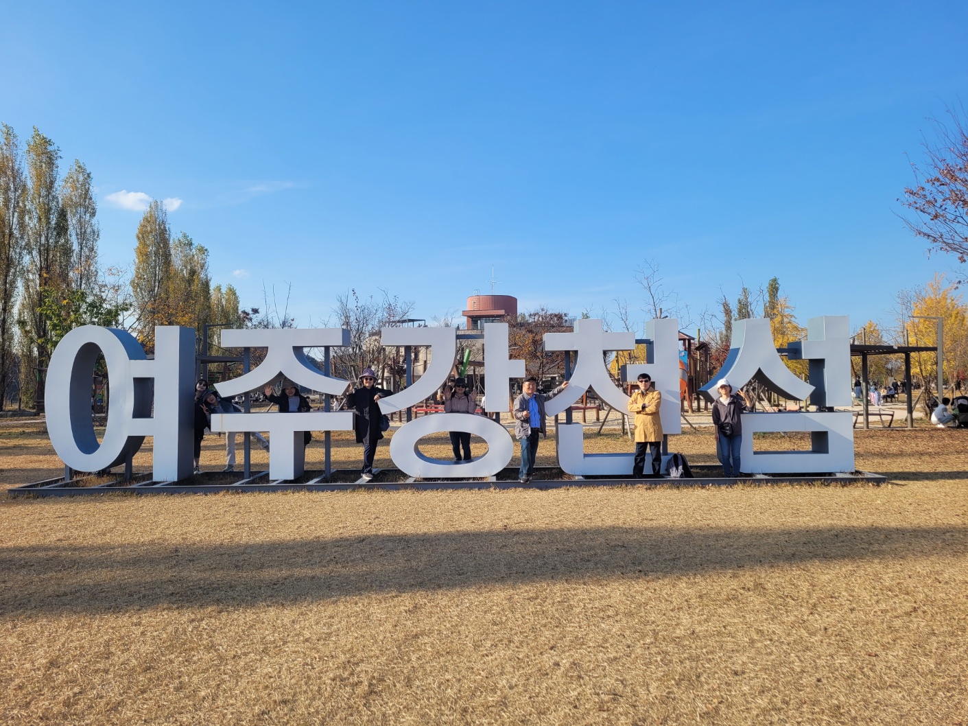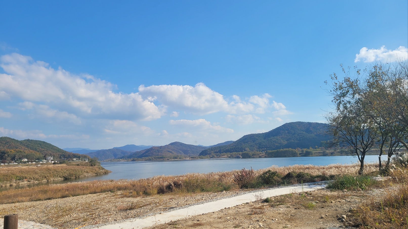 강천교를 건너 섬으로 들어가는 둘레길을 걸으며 곧 펼쳐질 멋진 섬 풍경이 기대되어 두근두근, 설렜어요. 파란 하늘에 뭉게구름이 떠 있는 전형적인 가을 날, 산책하기 딱 좋은 날씨여서 가던 길을 멈추고 일행들과 갈대 숲을 배경으로 사진을 찍었는데, 여기저기서 "넘 좋아요", "우와, 최고!!"라는 감탄사가 터져 나왔습니다.