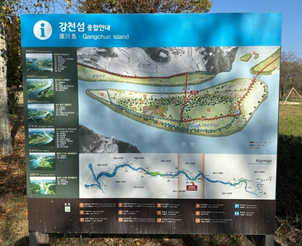 11월 둘째 주말, 서울에서 승용차로 3시간 정도 거리에 있는 은행 단풍 명소, 여주 강천섬에 다녀왔습니다. 강천섬으로 가는 길은 아래 입간판 지도에서 보듯이 강천교와 굴암교 두 개의 다리로 진입할 수 있는데, 섬 내에 차량 통행이 금지되어 걸어서 이동할 수 있습니다. 주말이라 주차장이 만원이라 주차하기 쉽지 않았어요(입장료, 주차료 무료).