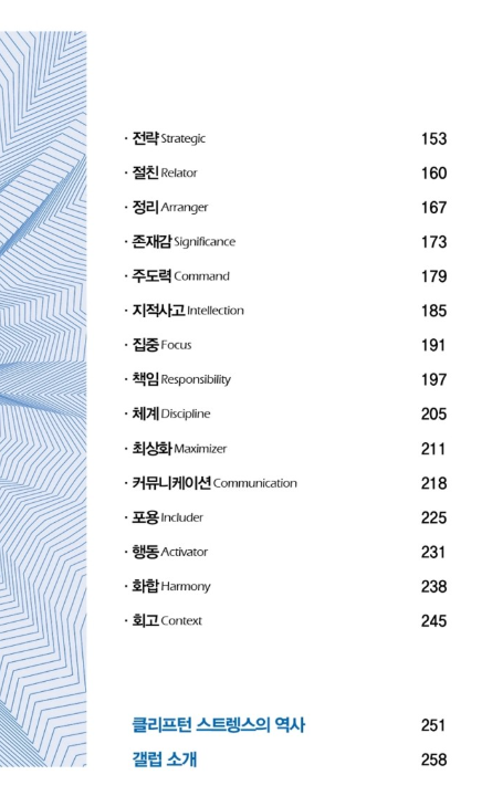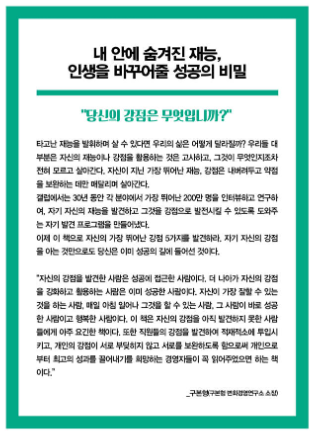 그렇다면 어떻게 하면 자신의 재능을 발견해 강점으로 개발할 수 있을까요? 이 책에는 독자 스스로 자신의 재능을 알아내고, 그것을 강점으로 발전시킴으로써 지속적이고 완벽에 가까운 실행을 할 수 있도록 돕는 프로그램이 담겨 있는데요. 그것이 바로 이 책의 핵심이라고 할 수 있는 클리프턴 스트렝스입니다.