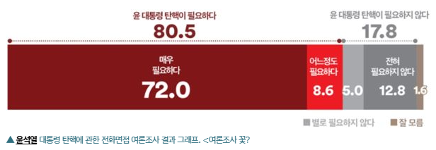 "국민 10명 가운데 8명 이상은 윤석열 대통령을 탄핵시켜야 한다고 생각한다"는 여론조사 결과가 나왔다. 여론조사 꽃이 12월 13일 발표한 여론조사에서 윤석열 대통령 탄핵 필요성을 물은 결과 ‘필요하다’가 80.5%, ‘필요하지 않다’는 17.8%로 집계됐다. ‘잘 모름’은 1.6%였다. 이번 조사는 여론조사 꽃 자체조사로 11일과 12일 전국 만 18세 이상 남녀 1,466명을 대상으로 실시했다. 지역별로 보수 지지세가 강한 대구·경북에서도 ‘탄핵이 필요하다’가 67.7%로 ‘필요하지 않다’(29.7%)를 두 배 이상 앞섰다. 다른 지역별 ‘탄핵이 필요하다’는 응답 비율은 광주·전라 95.8%, 인천·경기 81.9%, 서울 80.4%, 부산·울산·경남 78.6%, 대전·세종·충청 74.5% 등이었다.