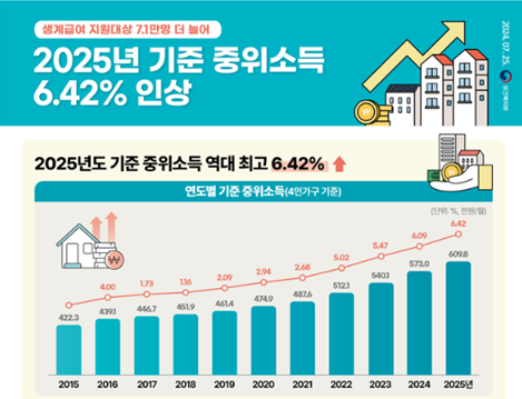 2025년도 기준 중위소득은 맞춤형 급여체제로 전환된 2015년 이후 역대 최대 증가율을 보였습니다. 4인 가구 기준으로 올해 572만 9,913원 대비 6.42%인상된 609만 7,773원, 생계·의료·주거·교육급여를 포함한 전체 수급가구의 약 74%를 차지하는 1인 가구 기준으로는 올해 222만 8,445원 대비 7.34% 인상된 239만 2,013원으로 결정됐습니다.🎻