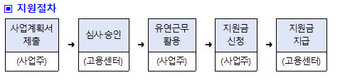지원유형: 재택근무, 원격근무, 선택근무, 시차출퇴근(육아기 자녀를 둔 근로자만 해당)