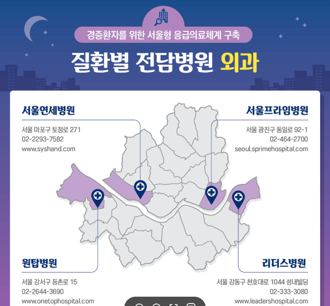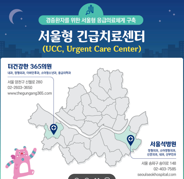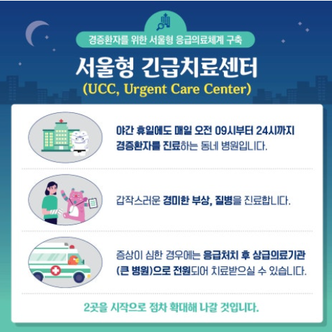 ✅ 응급실 이용이 어려운 경증 환자의 긴급한 야간 진료를 지원하는 서울형 긴급치료센터(UCC) 2개소와 질환별 전담병원(외과계) 4개소도 연휴 기간에 정상 운영.*