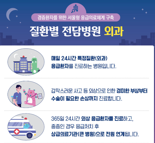 ✅ 매일 09시부터 24시까지 외상, 고열 등 급성질환을 진료하고, 질환별 전담병원은 매일 24시간 외과계 응급환자 진료.