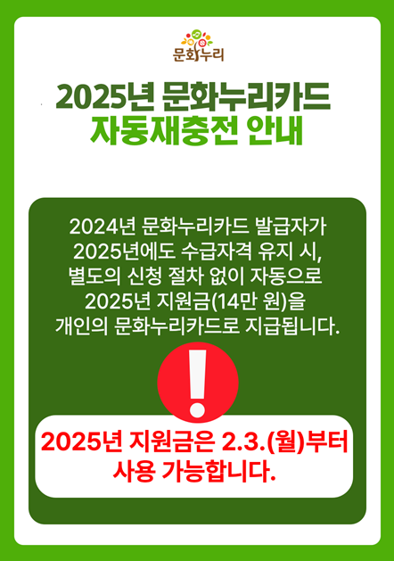지난해 문화누리카드 이용자 중 수급 자격을 유지하는 경우 별도 신청 없이 자동으로 올해 지원금이 충전됩니다. 지원금 자동 충전이 완료된 대상자에게는 알림 문자가 발송되며, 2월 3일 이후에는 전국 주민센터와 문화누리카드 누리집, 전화, 모바일 응용프로그램(앱)을 통해서도 자동 재충전 여부를 확인할 수 있습니다.*