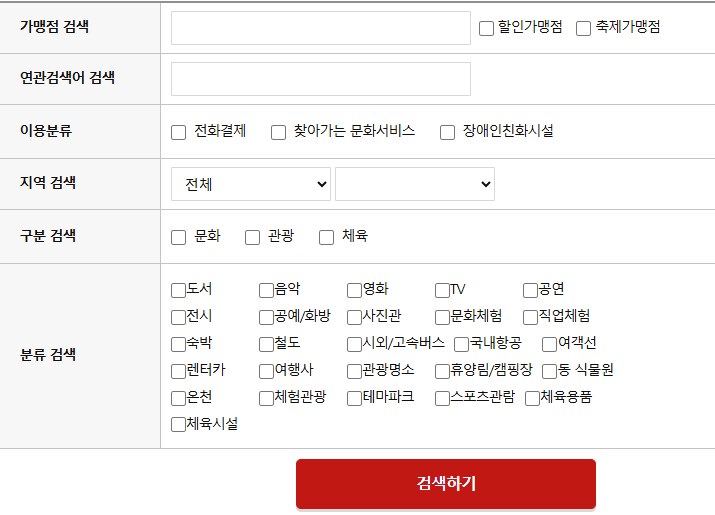 문화누리카드는 반드시 등록된 가맹점(온라인, 오프라인)에서만 결제가 가능합니다. 카드로 결제할 수 없는 곳에서 현금으로 전환하여 사용하실 수 없습니다. 문화누리카드 사용처로서 문화, 관광, 체육분야의 문화누리카드 가맹 업종을 리스트로 표시합니다. 검색하기를 통해 검색된 가맹점에서만 사용이 가능합니다.