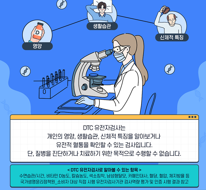 보건복지부는 11월 27일 보건복지부 고시「의료기관이 아닌 유전자검사기관이 직접 실시할 수 있는 유전자검사에 관한 규정」의 개정을 통해, 소비자 대상 직접 유전자검사(이하 ‘DTC 유전자검사’)의 검사허용 항목이 기존 57항목에서 최대 70항목까지 확대된다고 밝혔습니다.