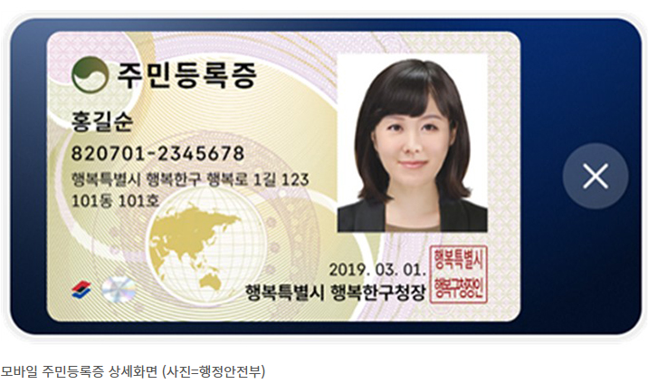 한편 모바일 주민등록증은 행정기관, 금융기관, 병원 등에서 실물 주민등록증과 동일하게 사용할 수 있는 바, 주요 공공서비스와 모바일 금융서비스에서의 사용범위도 확대되고 있다. [출처] 대한민국 정책브리핑