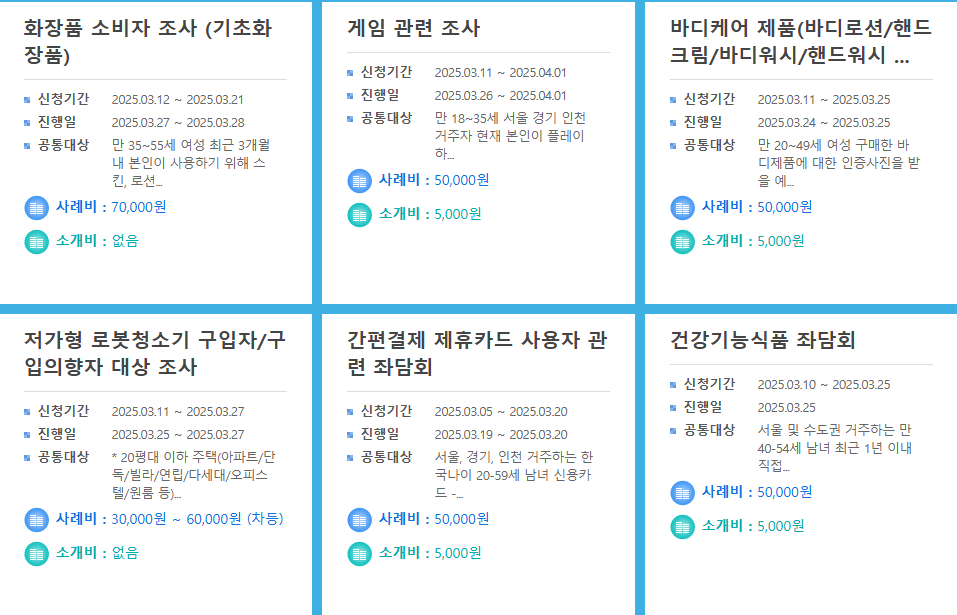 설문조사는 랜덤으로 뜨고 조사기간 내에 응답을 해야 돈을 받을 수 있다. 조사기간 중이어도 해당 나잇대 모집군에 대한 설문조사가 이미 다 끝난 경우에는 참여가 불가능하기도 하다. 해당 되는 경우에는 설문을 끝까지 마치고 각 설문별 부여된 금액을 받을 수 있으며, 조사 모집군에 해당이 안되는 경우에도 설문조사만 하면 50원을 지급해주기 때문에 설문조사가 뜨면 바로바로 참여하는게 좋다.