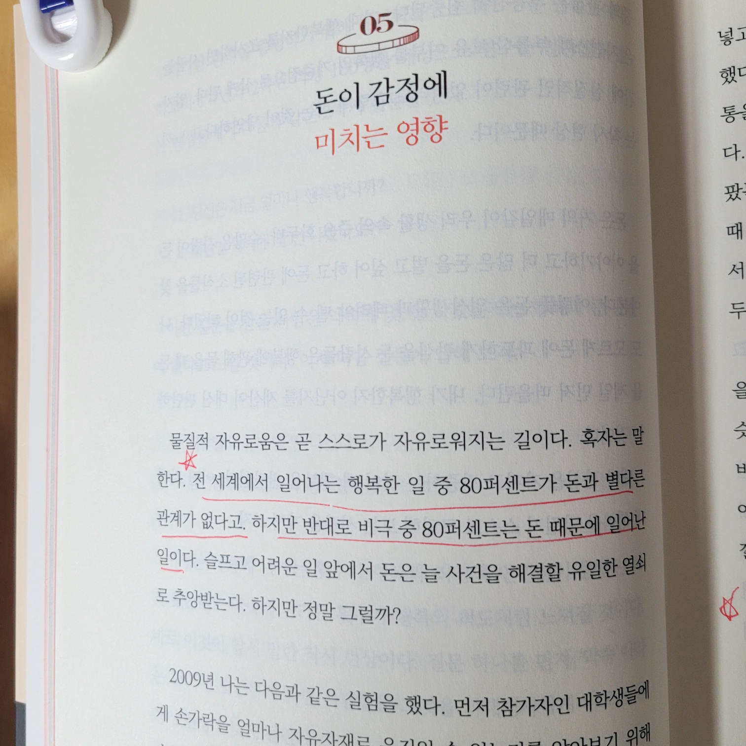 우리는 돈이 많으면 행복할 것이라 생각하지만, 과연 그럴까? 이 책은 돈과 행복에 대한 여러 연구를 소개하며 우리의 통념을 깨트린다. 예를 들어, 돈이 많아질수록 행복지수가 올라가는 것은 일정 수준까지만 해당된다. 연구에 따르면, 기본적인 생활이 가능할 정도로 충분한 돈을 가지는 것은 행복에 기여하지만, 그 이상이 되면 돈이 행복을 보장해 주지는 않는다. 오히려 지나치게 돈을 의식하면 불안과 스트레스가 증가할 수도 있다.