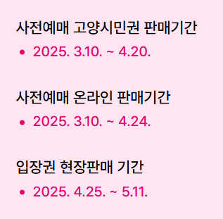 - 꽃향기 가득한 꽃박람회 축제를 더욱 알뜰하게 즐기고 싶다면 사전예매를 통해 미리 입장권을 준비하세요. 아름다운 봄날, 가족·친구·지인들과 더불어 꽃과 함께하는 '2025고양국제꽃박람회'에서 특별한 추억을 만들어보시기 바랍니다. 공연, 이벤트와 플라워마켓 등 최신 정보는 고양국제꽃박람회 공식 웹사이트를 참고하세요. 이번 블로그 포스팅이 도움이 되셨나요? 댓글로 여러분의 의견을 남겨주세요