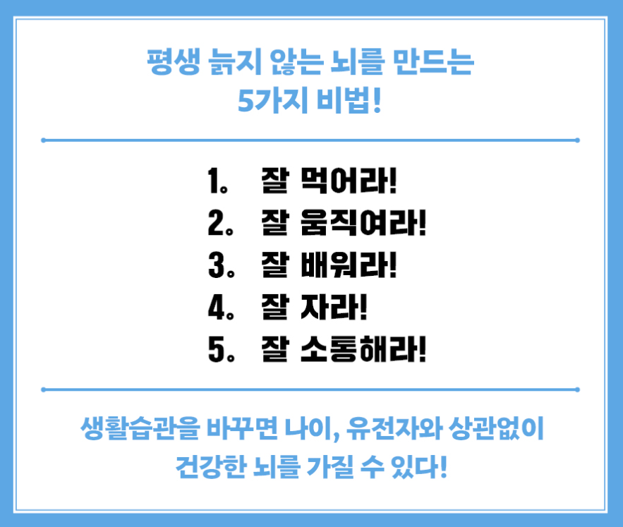 🔰 최근까지도 뇌는 특정 시기까지만 발달하고 이후로는 쇠퇴한다는 게 통념이었다. 하지만 평생 뇌 기능을 건강하게 유지하는 일이 가능하다는 사실을 보여주는 과학적 증거들이 점점 늘어나고 있다. 나이 들어서 머리가 잘 안 돌아간다거나 나이 먹으면 뇌도 늙는다는 말은 더 이상 ‘팩트’가 아닌 것이다.
