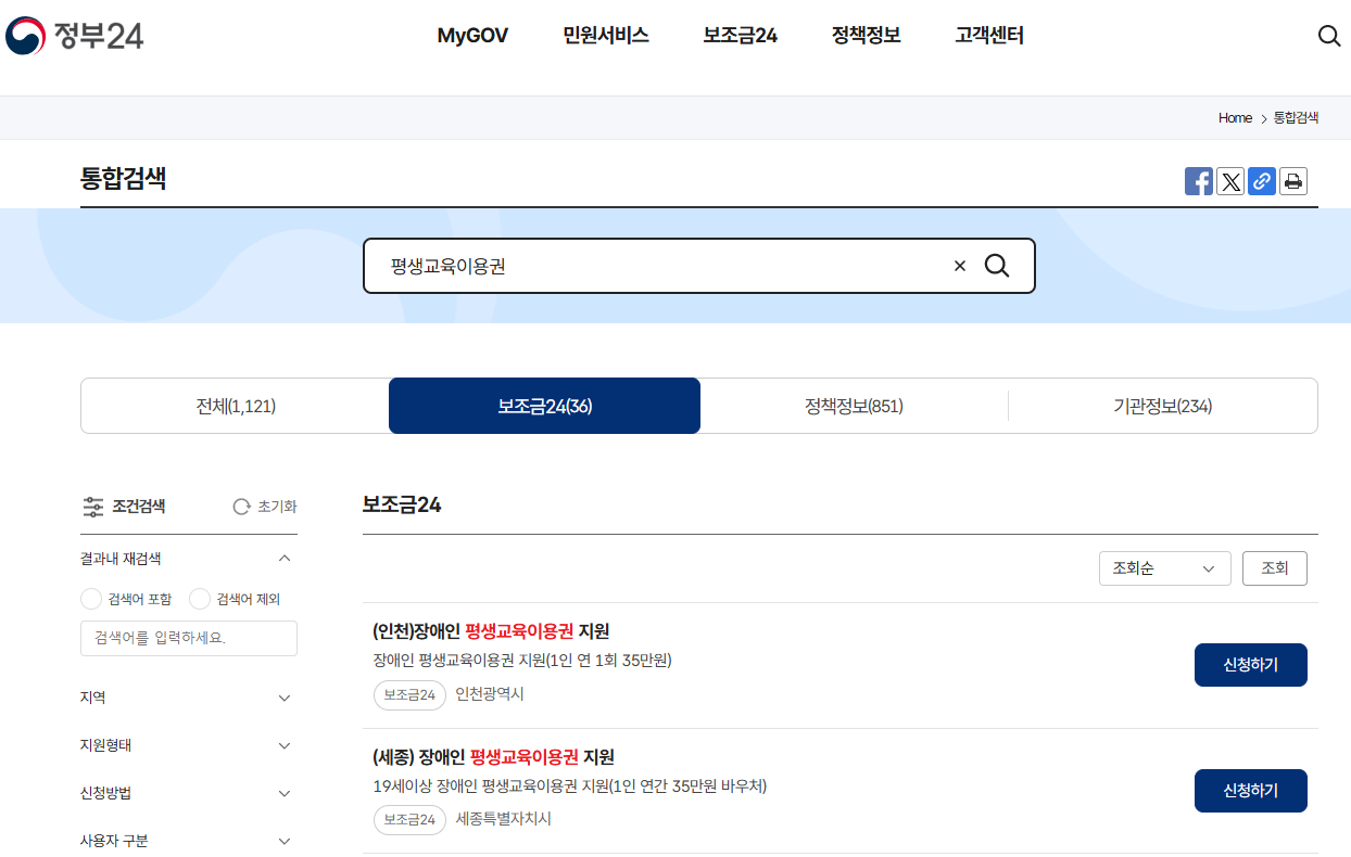 🔰 '보조금24' 누리집(http://www.gov.kr, 장애인 이용권 대상)