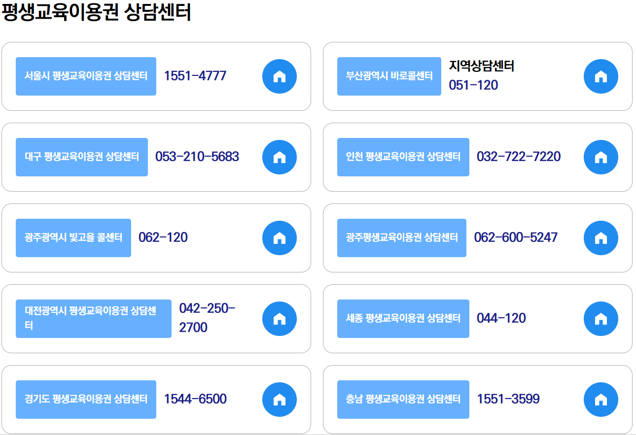 ✔ 평생교육이용권 사용기관으로 등록된 기관 내에서 지역 구분 없이 수강할 수 있으며, 사용기관은 평생교육이용권 누리집과 광역자치단체별 누리집에서 확인하면 됩니다.