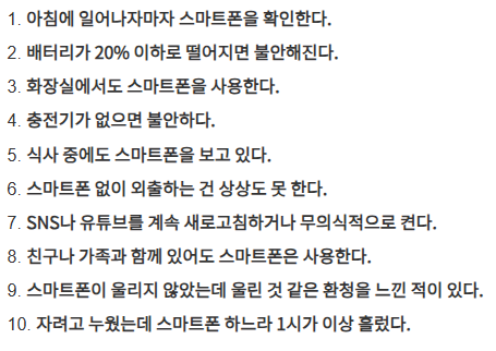 하루에 스마트폰을 얼마나 사용하는지, 사용빈도, 스마트폰을 대하는 내 모습은 어떤지 체크해 보세요.