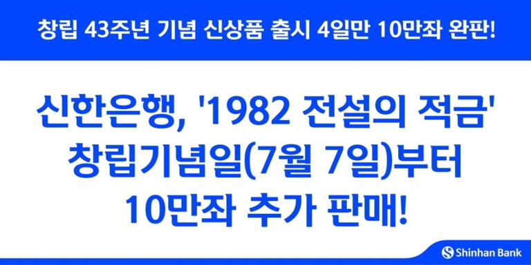 요즘 같은 저금리 시대에 연 7.7%라는 금리를 제공하는 적금이 있다고 해서 눈길을 끄는데요. 신한은행이 창립 43주년을 기념해 출시한 '1982 전설의 적금'입니다. 지난 1일 출시 후 단 나흘 만에 10만 계좌가 완판되는 기록을 세우며, 7일부터 추가로 10만 계좌를 더 판매한다고 발표했습니다. 인기가 높은 이 상품에 대해 좀 더 자세히 알려드릴게요.