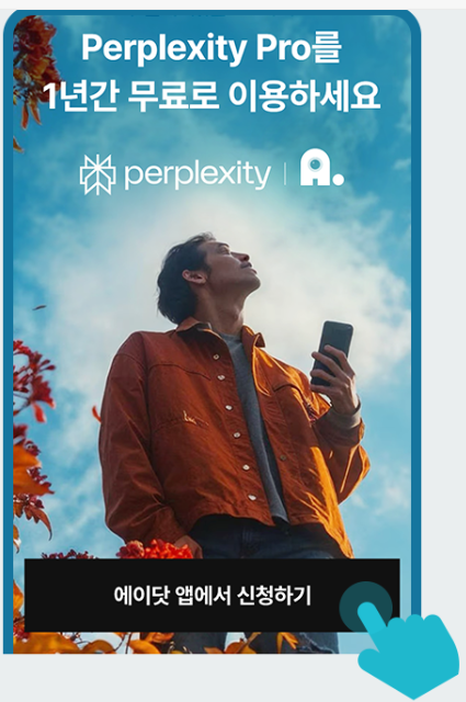 3️⃣ 3단계: 신청완료하기 에이닷 앱에서 '지금 신청하기' 버튼 클릭, 간단한 약관 동의 후 신청 완료, 퍼플렉시티 계정 생성 또는 기존 계정 연결합니다.