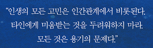 우리는 모두 변화를 원하는데요. 지금보다 더 자유로운 삶, 지금보다 더 행복한 삶, 지금보다 더 성공적인 삶을 꿈꿉니다. 하지만 우리는 핑계를 대거나 미루거나 쉽게 포기합니다. 이에 대해 아들러는 “인간은 변할 수 있고, 누구나 행복해질 수 있다”면서 단, 그러기 위해서는 ‘용기’가 필요하다고 합니다. 자유로워질 용기, 평범해질 용기, 행복해질 용기, 그리고 미움받을 용기. 자유롭고 행복한 삶을 원한다면, 지금 당신에게 필요한 것은 ‘용기’입니다.