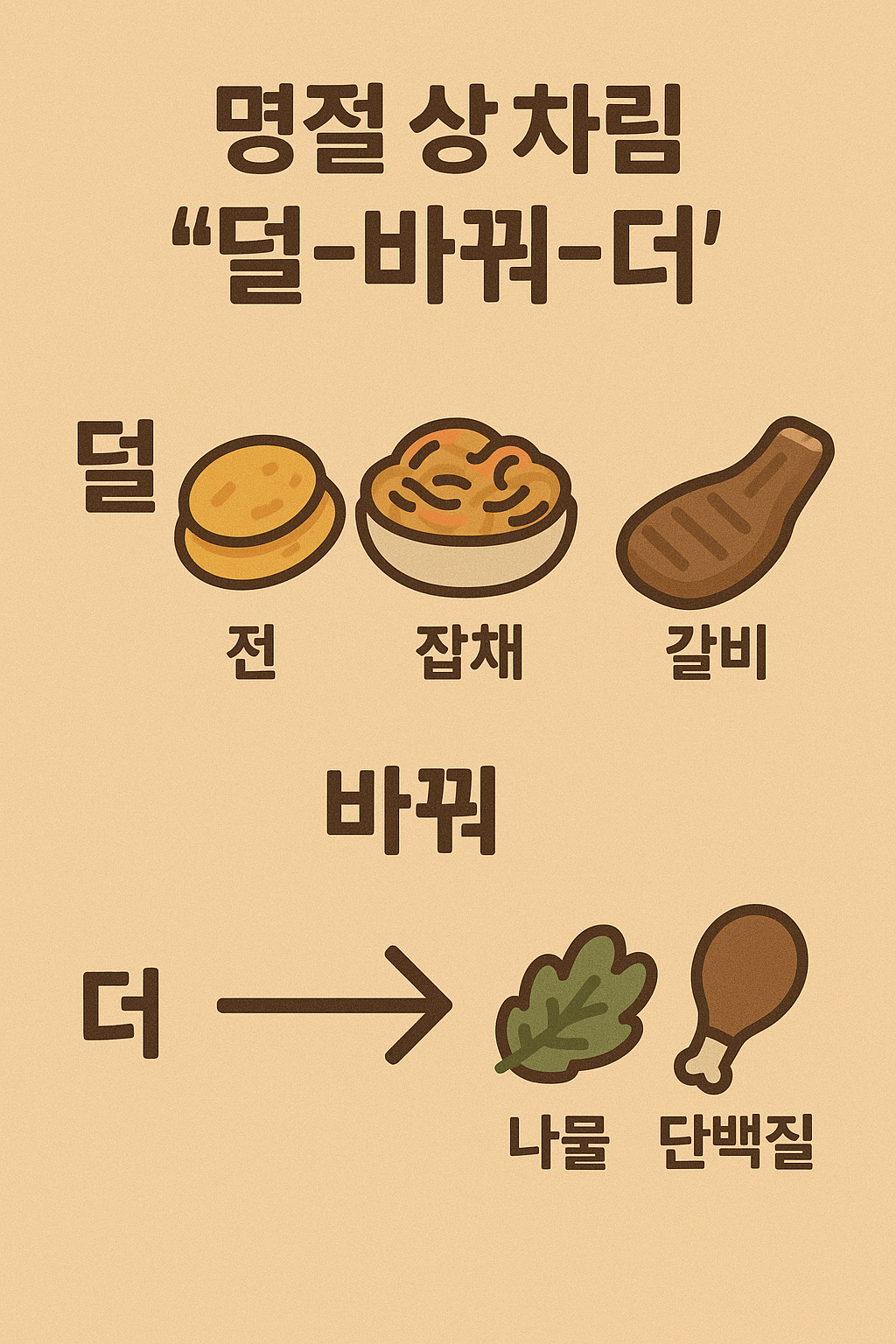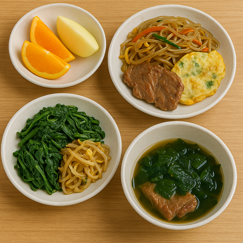 - 점심(가족 식탁): 전 1~2장 + 잡채 반 접시 + 고기 100g + 나물 2종 듬뿍 + 과일 소량.