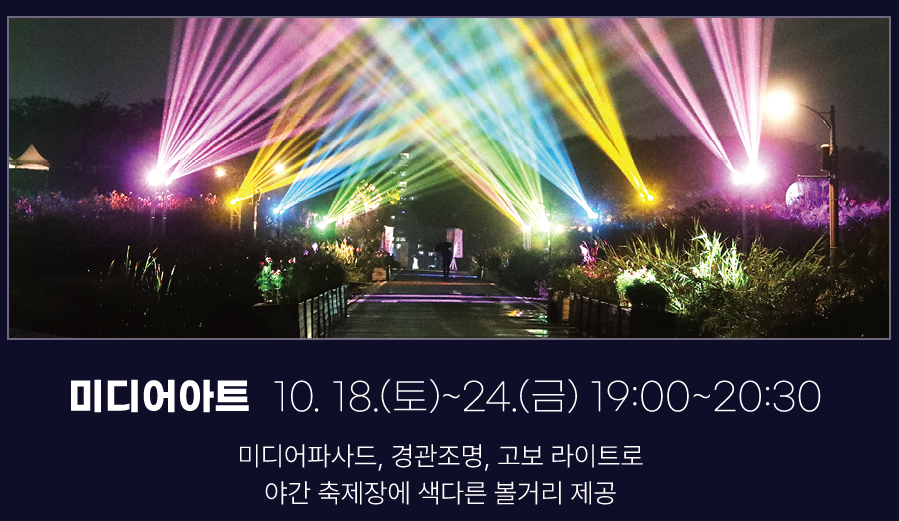 ‘미디어아트’는 10월 18일~24일 오후 7시부터 8시 30분까지 운영합니다. 하늘공원 십자로 중앙로에는 상호작용이 가능한 인터렉티브 미디어 ‘빛의 숨결’이 상영되며, 산책로 입구에는 4명의 작가의 미디어 작품을 한데 어우른 ‘버추얼 파빌리온’을 관람할 수 있습니다. 저도 다음 주에 가보려고 해요.