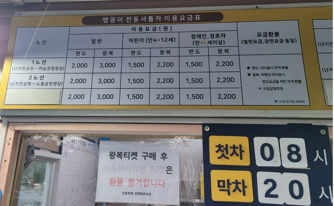※ 하늘공원 정상까지 왕복 운행하는 맹꽁이 전동셔틀카 이용요금표 참고하세요.