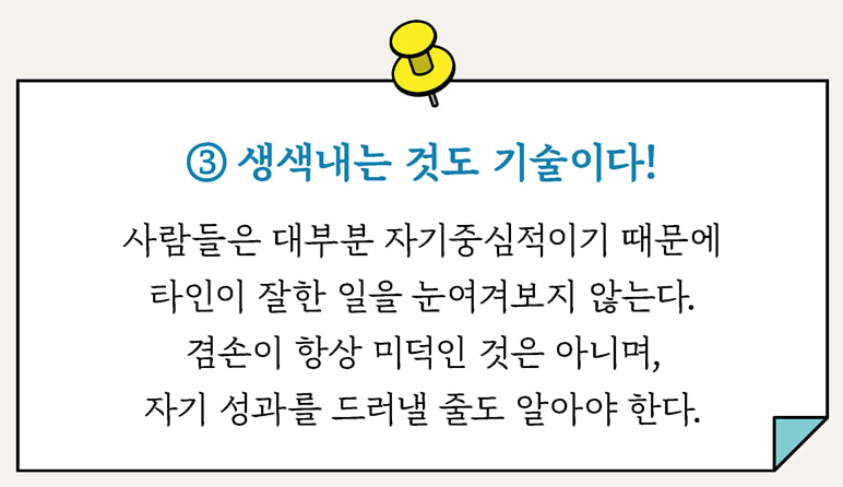 바뀌지 않는 서로의 행동을 탓하며 같은 싸움을 지속하고 있다면 사람은 누구나 하던 대로 하고 싶어 한다’는 사실을 되새겨 보라. 그저 인간이라면 누구나 갖고 있는 습성 탓에 변화를 어려워하는 것뿐이다. ... 때로는 타인을 바꾸는 것보다 내 태도와 행동을 바꾸는 것이 더 쉬울 때도 있다(214-215).