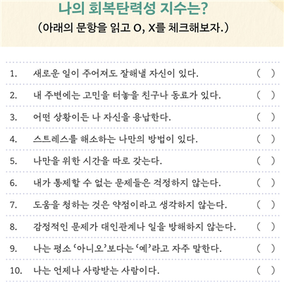 저자는 풍부한 경험과 지식을 바탕으로 회복탄력성의 원리를 독자들이 이해하기 쉽게 설명하고 있는데요. 회복탄력성 계발을 위해 필요한 마음 근육을 6가지 키워드(대인관계, 유연성, 끈기, 자기조절, 긍정성, 자기돌봄)로 명쾌하게 정리했습니다. 운동을 통해 몸의 근력을 강화하듯, 회복탄력성 훈련을 통해 마음의 근력도 충분히 키울 수 있다는 거죠. 또한 이해를 돕기 위해 생생한 사례들을 이 책에서 볼 수 있습니다. 그럼 지금 내 마음이 어떤 상태인지 먼저 진단해 볼까요?