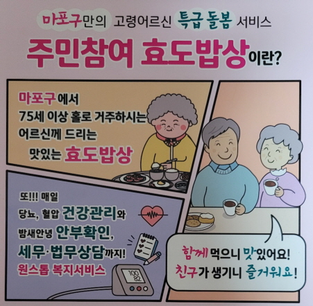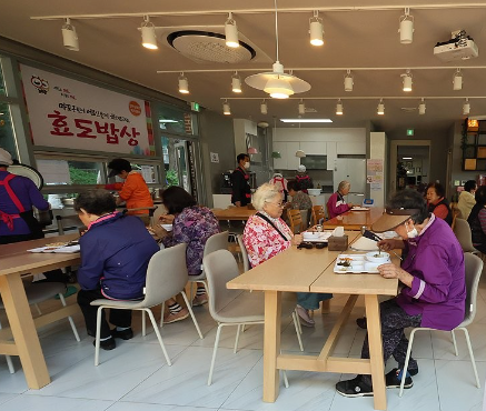 초고령사회 진입을 앞둔 내년에는 65세 이상 인구가 1,000만 명을 넘을 것으로 보인다. 2030년이면 고령층이 인구의 4분의 1이 될 예정이다. 그런데 한국의 노인 빈곤율은 40.4%로 경제협력개발기구(OECD) 38개 국가 중 1위다. 이에 ‘효도밥상’ 사업은 서울 마포구가 전국 최초로 도입한 것으로, 돌봄이 필요한 고령층을 대상으로 주 6일 간 무료로 하루 한 끼를 차리는 돌봄 서비스다. 75세 이상 어르신이 집 근처 효도밥상으로 지정된 식당에 가면 일요일을 제외하고 매일 무상으로 균형 잡힌 식사를 할 수 있게 한 것이다.