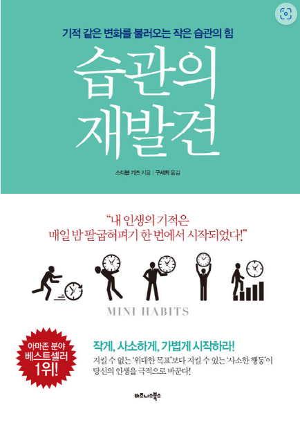 우리가 원하는 변화의 지점까지 이르자면 처음에는 작게 시작하는 것이 거부감을 줄일 수 있다는 것이다. 그러자면 습관이 자리 잡기까지 초기단계에서 지루함을 견뎌내는 것이 관건이다. 이를 위해 보상이 필요하다. 작은 습관→ 보상 →긍정의 변화 →성취의 기쁨을 가져온다는 것이다.