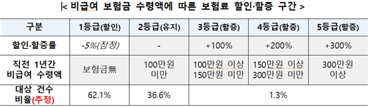 반면 ③(할증) 비급여 보험금 수령액이 100만 원 이상(100~150/150~300/300만 원 이상)인 경우 비급여 보험료가 +100/200/300% 할증된다. 할증대상자의 할증 금액으로 할인대상자의 보험료를 할인하며, 할인율은 약 5% 내외일 것으로 예상된다(보험사별 상이).