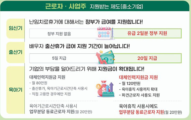 그리고 제도는 마련되어 있지만, 육아휴직을 편히 쓸 수 없는 사람들도 많은데요. 이에 대해 정부가 기업의 부담을 덜어 주기 위해 지원금을 올립니다. 배우자 출산 휴가급여 지원 기간도 5일에서 20일 지급으로 늘어나고, 난임치료 휴가도 2일간 정부가 지원합니다. 그리고 대체인력 지원과 동료업무분담 지원금을 신설하고, 대체인력지원금도 80만 원에서 120만 원으로 인상하는 등 일하는 부모와 사업주에 대한 지원을 대폭 강화됩니다.