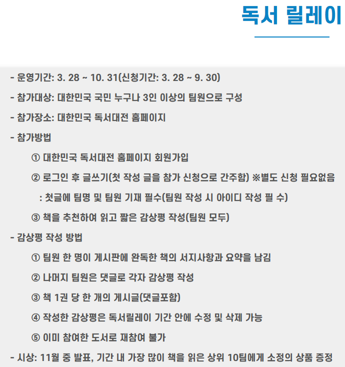 한편, 올해 ‘대한민국 책의 도시’로 선정된 포항시와 한국출판문화산업진흥원은 포항 영일대 해상누각 일원에서 오는 9월 27일부터 29일까지 올해로 11년째를 맞이하는 ‘대한민국 독서대전’ 행사를 개최합니다. ‘동해바다,책을 만나다’를 주제로 출판사와 서점, 독서계 관계자, 국민 등 다양한 사람들과 함께 강연·북토크, 전시, 공연, 컨퍼런스, 체험행사 등을 통해 책으로의 항해를 떠날 예정인데요. 일정과 참여 방법 등 자세한 사항은 공식 누리집(korearf.kpipa.or.kr)에서 확인하세요.