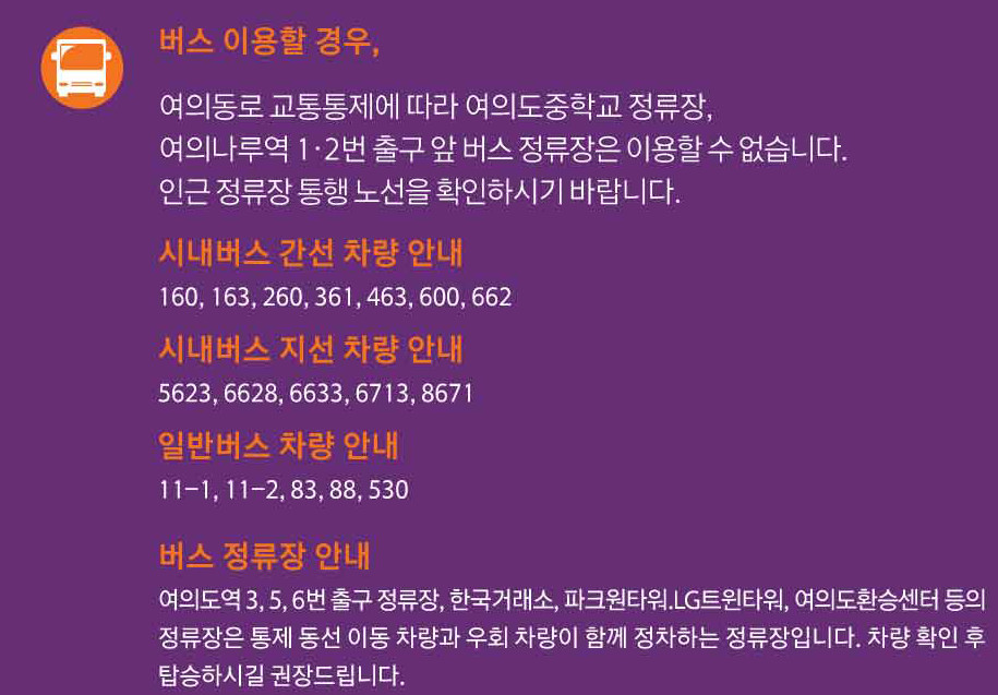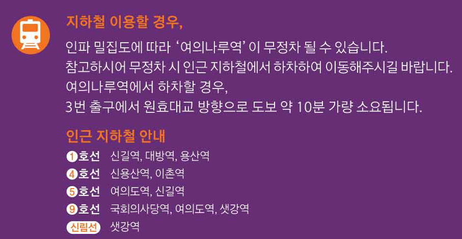 그날은 행사 장소 주변이 무척 붐빌 텐데요. 불꽃축제가 열리는 장소까지 이동하려면 63빌딩 주변 도로가 전부 통제되기에 대중교통을 이용하는 것이 가장 좋습니다. 자차를 이용한다면 행사장과 떨어진 공영주차장에 주차하고 이동하시는 걸 추천합니다.