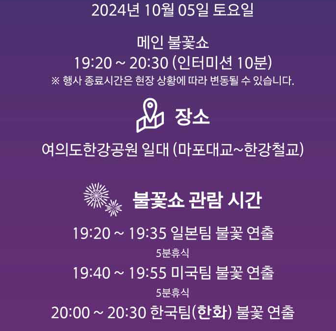 축제는 10월 5일 오후 1시부터 여의도 한강공원 인근에서 펼쳐지는데요. 오후 1시부터 7시까지는 주최측이 마련한 홍보부스에서 축제 분위기를 한층 돋우는 프로모션과 이벤트가 있고, 7시에 개막식을 시작으로 본격적인 불꽃축제는 7시 20분부터 8시 30분까지 진행됩니다.