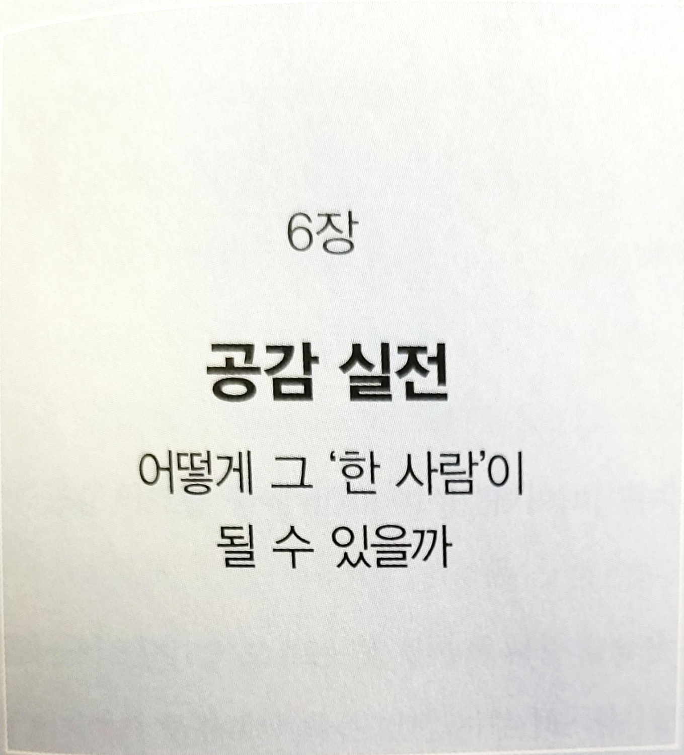 4장에서는 사람은 모두가 개별적 존재임을 환기시키고, 공감의 정확성을 높이는 경계 짓기를 제안한다. 5장에 서는 사랑에 대한 욕구, 콤플렉스, 집단 사고 등 진정한 치유를 방해하는 공감의 허들을 짚어 준다. 6장에서는 존재를 살리는 ‘한 사람’이 되기 위하여 유념해야 할 실전 치유 팁을 구체적인 상황을 통해 보여 준다