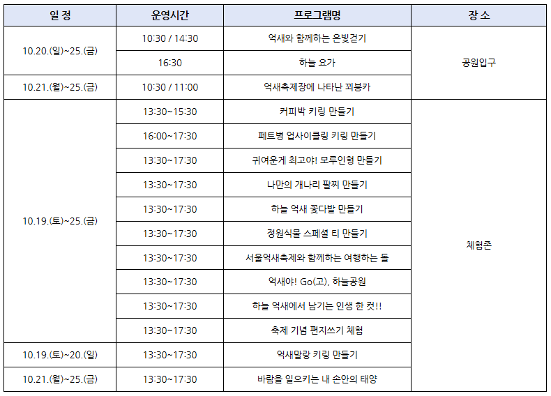 서울억새축제에서만 즐길 수 있는 특별한 15가지 체험프로그램은 '억새와 함께하는 은빛 걷기', '하늘요가', '억새축제장에 나타난 꾀붕카', '커피박 키링 만들기', '패트병 업사이클링 키링 만들기', '하늘 억새 꽃다발 만들기', '억새야! Go(고), 하늘공원', '축제기념 편지쓰기 체험',  '바람을 일으키는 내 손 안의 태양' 등  다양하게 준비되어 있는데요. 아래 표를 참고하세요.