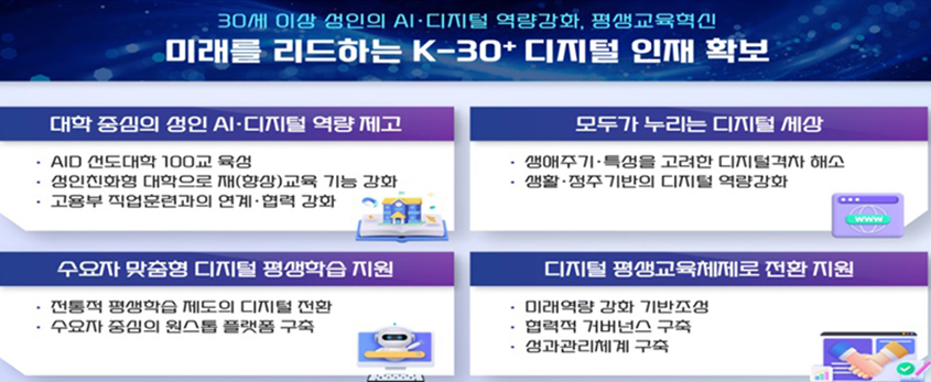 교육부는 30대 이상 성인의 인공지능·디지털 역량을 강화하고 재교육·향상교육을 돕기 위해 디지털 평생학습 생태계를 구축하는 ‘인공지능·디지털(AID) 30+ 프로젝트’를 마련했습니다. 이번 프로젝트는 우리나라의 인재 분야 디지털 기술 능력과 직원 교육 분야의 경쟁력을 높이기 위함입니다.